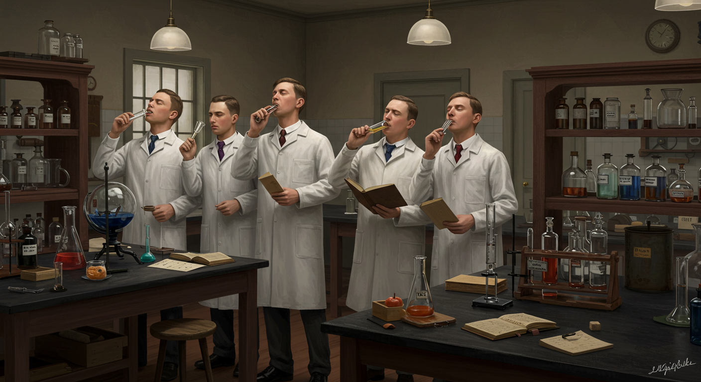 最初に試験された化学物質はホウ砂でした。当初、シェフはそれをバターに隠そうと試みました。しかし、被験者たちはすぐにその嫌な金属の味に気づき、バターを全く食べなくなってしまいました。ワイリー博士は次に牛乳とコーヒーで試しましたが、結果は同じでした。 ボランティアによるこの本能的な(無意識の)拒否反応は、興味深く、思いがけない発見でした。これにより、ワイリー博士は実験方法の変更を余儀なくされました。彼は添加物を隠す努力を諦め、代わりにゼラチンカプセルに入れて投与するようになりました。被験者たちは食事の途中でこれを飲み込みました。 1902年のボランティアたちのクリスマスディナーのメニューが公開されたのですが、そこにはアップルソースから七面鳥、コーヒーに至るまで、ほとんどすべての品目の後に「ホウ砂」と、ユーモラスで不気味に記されていました。 実験が進むにつれ、被験者たちは時折、この陰気な日常を盛り上げようと試みました。ある時、一人のボランティアが同僚の飲み物にキニーネを混ぜるといういたずらをしました。キニーネを飲んだ同僚は体の不調を訴え、「科学のために死ぬ覚悟ができた」と信じ込みましたが、後にそれが冗談だと気づきました。